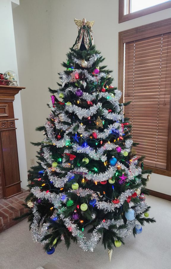 On Sunday afternoon, my husband and I put up the old artificial Christmas tree in our family room, as we always do over Thanksgiving weekend. We bought it in 2004, when our kids were little and we were in our starter house. The tree looks too short for the tall ceiling here, and every year more plastic needles fall off. We can’t bring ourselves to throw it away because of fond memories. But at least, it’s had a bit of a makeover with new, thicker tinsel strands to brighten it up.