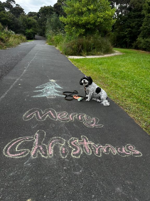Remi the Artist Dog, merrily enjoying Christmas in the summer.